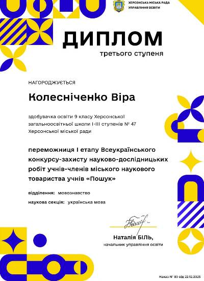 Вітаємо наших учнів Молдована Дениса та Колесніченко Віру за перемогу в І етапі Всеукраїнського конкурсу-захисту науково-дослідницьких робіт учнів-членів міського наукового товариства «Пошук». Бажаємо подальшого інтелектуального росту, великих звершень, нових знань і яскравих емоцій!